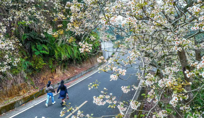 游客打卡春日“雪”景。陈志鹏 摄