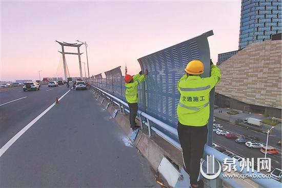 连日来,在泉州晋江大桥北引桥处,施工人员在靠近居民区的两侧栏杆上加装高2.5米的声屏障,该声屏障整体色调与桥体一致,共安装1.3公里,目前已全部装好。据悉,安装声屏障将有效隔离大桥噪声污染,减少大桥车辆通行对附近居民区的影响。(陈晓东 陈淑华 摄) |