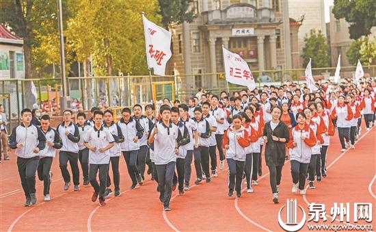 培元中学的学生在老师的带领下进行千米长跑 备战要领 如何备战中考体育,成为众多学生和家长关心的焦点。多位体育老师表示,想“过关”要多练,关键在于提升体能,这不仅是初中阶段的任务,更需要从小学开始重视。而这,就需要学生、家长、学校等各方共同发力。 科学报考: 针对个人体质选择项目 2021年泉州中考体育项目全部确定,考生若不注意的话,会在报考环节就出错,有的同学对自己认知不够,随意填报,有的同学是家长直接帮忙填报。对此,戴文强建议,同学们应根据自己所学的知识、技能的掌握情况,参照中考的评分标准,积极主动与体育老师、班主任协商,准确地选报志愿。同时,体育成绩与文化课成绩的提高有很大的不同,它不像数学题学会一个公式后可以反复套用,体育项目需要的是时间的积累,因此,考生一定要保证规律性的运动时间。 戴老师说,按往年报考情况看,2021年体育抽选考项目,男生选择50米跑、实心球的人数会超过95%;而女生上肢力量相对较差,实心球需要力量和动作技术相结合才能考出好成绩,很多女生会选择50米跑、斜体向上,估计报考人数会占95%以上。 体能积累: 持之以恒每日适量运动 学生体能欠佳,耐力不足,提高体能是“通关”中考体育的关键。因此,我市各所中学十分注重体育课外的体能积累。如泉州外国语学校洛江校区从2018年9月开始,要求雨天除外的日子里,初一至高三年学生以班级为方阵进行跑操。杨俊健介绍,该校学生早晨6点起床,6点半陆续到操场找到班级方阵,在领跑员的带领下有序绕场跑操约1公里。跑操结束后,各班围成一圈进行晨读。中学生结束晨跑后,7点,小学全托生开始跑操。校长林建生亦每天早晨陪学生跑步。到了傍晚,初一至高三学生再次跑操。 “每天锻炼一小时,健康生活一辈子。”许文恺说,虽然每天的运动量不大,但日积月累,学生的体能会在不知不觉中获得提升。 培元中学也组织初三学生周一至周五上午的大课间(9时35分)长跑1000米,上午10时30分高三学生长跑1000米,每班的班主任陪跑,激励学生持之以恒。抽考类项目和抽选考类项目确定后,该校目前体育课都围绕这些项目进行练习,在体育中考前夕,学校也会组织体育模拟考,帮助学生提前适应考试氛围。 据了解,目前泉州各校体育老师都在有计划、全方位地进行授课,在学校进行体育运动,场地、器材都比较齐全,还有专业老师进行指导。而在家里,受到场地器材的限制,同学们要有选择性地进行锻炼。戴文强建议,在家时学生可以利用跑楼梯、长时间的跳绳等方式练习,周末家长最好主动带孩子进行越野跑,亲子互动更能调动孩子锻炼的积极性,提高心肺功能。再者,家里可以买个实心球,对着小区墙壁投掷,也能收到很好的效果。篮球运球属于可突击项目,临考前可以适当增加训练次数,学生可利用空闲时间,到小区内的篮球场加强练习,就能保证通过率;引体向上和斜身引体有简易支架,可以自行购买在家练习,临考前都会有长足的进步。