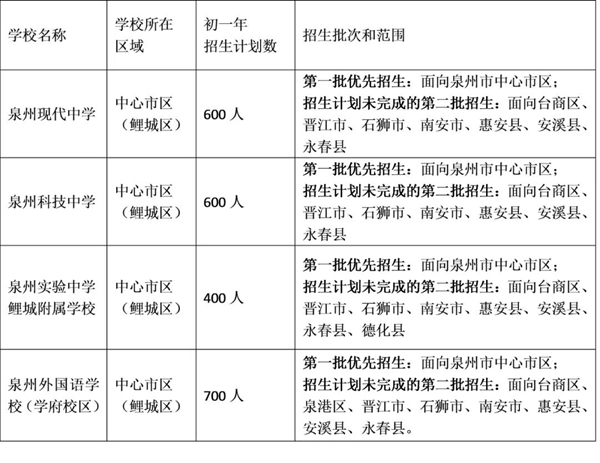 鲤城区公办初中学校招生电脑派位时间为7月5日,派位结果由原毕业小学公示并通知到每一位学生,各公办初中学校公布录取名单。7月20日前,小学毕业生到直升或派位就读学校办理初中入学注册手续。7月22日前各公办派位学校将新生报到花名册报送鲤城区招考中心,7月25日前到区招考中心办理初中新生录取确认手续。8月15日前,公办初中学校的招生录取结果上传至泉州市义务教育招生信息管理平台。 民办初中学校招生办法 按照福建省教育厅和泉州市教育局要求,民办初中学校各批次招生都须在泉州市义务教育招生信息管理平台上实行统一网上报名。公、民办初中学校同步进行报名招生,允许学生兼报。泉州现代中学、泉州科技中学、泉州实验中学鲤城附属学校、泉州外国语学校(学府校区)等民办初中学校报名人数未超过招生计划数的,学校应一次性全部录取;当报名人数超过招生计划数的,全部实行电脑随机派位录取。 民办中学计划招生数