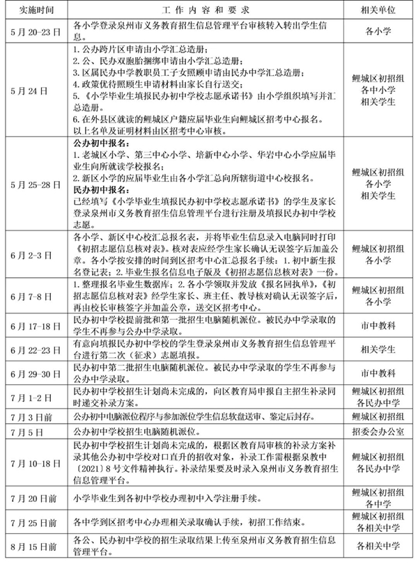 以下这些情况要注意! “回原籍学生”户籍迁入时间为2021年3月1日前并符合户籍、住房产权、实际居住“三一致”,即适龄儿童与其父母(或祖父母、外祖父母)户籍一致并实际共同居住,户籍与房产一致(产权性质、用途为住宅),房产与实际居住一致,于5月23日前带齐相关材料到我区招考中心办理申请回原籍升学手续。要求跨片区填报志愿的学生,应在5月23日前提出书面申请,填写《2021年鲤城区初中新生申请跨片区派位登记表》并提供相关材料报送鲤城区招考中心审核后,经批准,方可改变片区填报志愿。 自2022年秋季起,因居住地或户籍变迁要求在我区就读初中的,户籍迁入时间应年满1年,即2021年9月1日前迁入我区,并满足户籍、住房产权、实际居住“三一致”。2021年3月1日以后(包括3月1日)新购房落户的,应满足适龄儿童的父母(或祖父母、外祖父母)拥有该实际共同居住的住房产权比例应超过50%(不包括50%,产权证或不动产登记证上没注明共有产权人产权比例的,视为平均分配),且同一套住房每三年只能有一位适龄儿童申请在我区参加公办中学小升初(同一户主、子女多于一个的家庭除外)。 非鲤城区户籍,在鲤城区实际居住务工并具有居住证、务工证(劳动合同或营业执照)(以下称“两证”)人员,申请其适龄随迁子女到我区公办初中入学,需提供:适龄儿童的父母一方的“两证”,须达到1年6个月及以上(即居住证、劳动合同或合法有效的个体工商营业执照签发时间为2020年3月1日前),且目前仍在该区居住、务工(经商)。 户籍在鲤城、丰泽、洛江、泉港区和台商投资区的人员(以下称“五区人员”),在我区务工并暂住,居住地与户籍地不一致、不能申领到居住证的,申请其适龄子女到我区公办初中入学,需提供:①达到1年6个月及以上的合法房屋租赁合同(房屋租赁合同签订时间为2020年3月1日前);②父母双方或一方在我区连续参加社会保险满6个月及以上的证明等材料。 自2022年秋季招生起,没有居住证的“五区人员”申请其适龄子女到我区公办初中入学,需提供:①达到1年6个月及以上的合法房屋租赁合同(房屋租赁合同签订时间为2021年3月1日前)及年满一年以上的房屋租赁的正式发票(自2023年秋季起,房屋租赁的正式发票应满1年6个月);②父母双方或一方在我区连续参加社会保险满1年及以上的证明等材料。 值得注意的是,鉴于鲤城公办初中学位较为紧张,满足以上条件的外来务工随迁子女可持以上有效证件于7月20日前到鲤城区教育局登记,统筹协调到泉州明新华侨中学和泉州凌霄中学就读。拒不服从安排的,视为自动放弃申请在鲤城就读公办初中的资格。 招生工作安排 重要时间点请查收 鲤城区公办初中学校招生电脑派位时间为7月5日,派位结果由原毕业小学公示并通知到每一位学生,各公办初中学校公布录取名单。7月20日前,小学毕业生到直升或派位就读学校办理初中入学注册手续。7月22日前各公办派位学校将新生报到花名册报送鲤城区招考中心,7月25日前到区招考中心办理初中新生录取确认手续。8月15日前,公办初中学校的招生录取结果上传至泉州市义务教育招生信息管理平台。 |