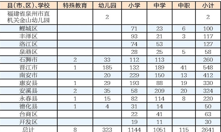 2023年全省中小学、幼儿园新任教师公开招聘25日起开始网上报名,报考人员可登录福建省教育考试院官网(www.eeafj.cn)报名,网上报名时间截至3月31日17点30分。 据悉,在今年全省新任教师公开招聘中,泉州市市直机关金山幼儿园和各县(市、区和开发区、台商投资区)均有招聘教师计划,共计新招聘公办教师2641人(详见表格)。各地招聘单位、岗位、人数及资格条件,报考人员可上网查询《2023年泉州市公办学校公开招聘新任教师岗位信息表》。