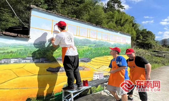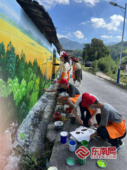实践队队员在细心地为墙绘主题填色。实践队 供图 |
